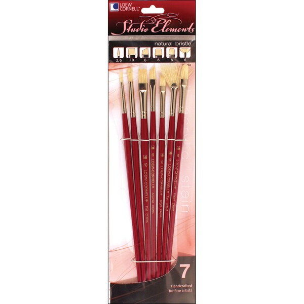 This package contains seven paintbrushes designed for use with oils acrylics and stains. Each one has natural bristles with an 8 inch long wood handle and a 1-1/4 inch long metal ferrule. BrandLoew-CornellSizes include Round 2 Round 6 Flat 10 Angular Flat 6 Bright 6 Filbert 8 and Fan 6Imported