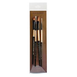 This Dynasty black gold brush set features 3 black gold series watercolor brushes made specifically for creating the effects in landscapes and portraiture. These brushes have black ferrules and varnished handles. Quantity 4 watercolor brushesIncludes One size 8 wave one size 4 round one size 0.375 dagger and one size 1 linerHandles Short handled